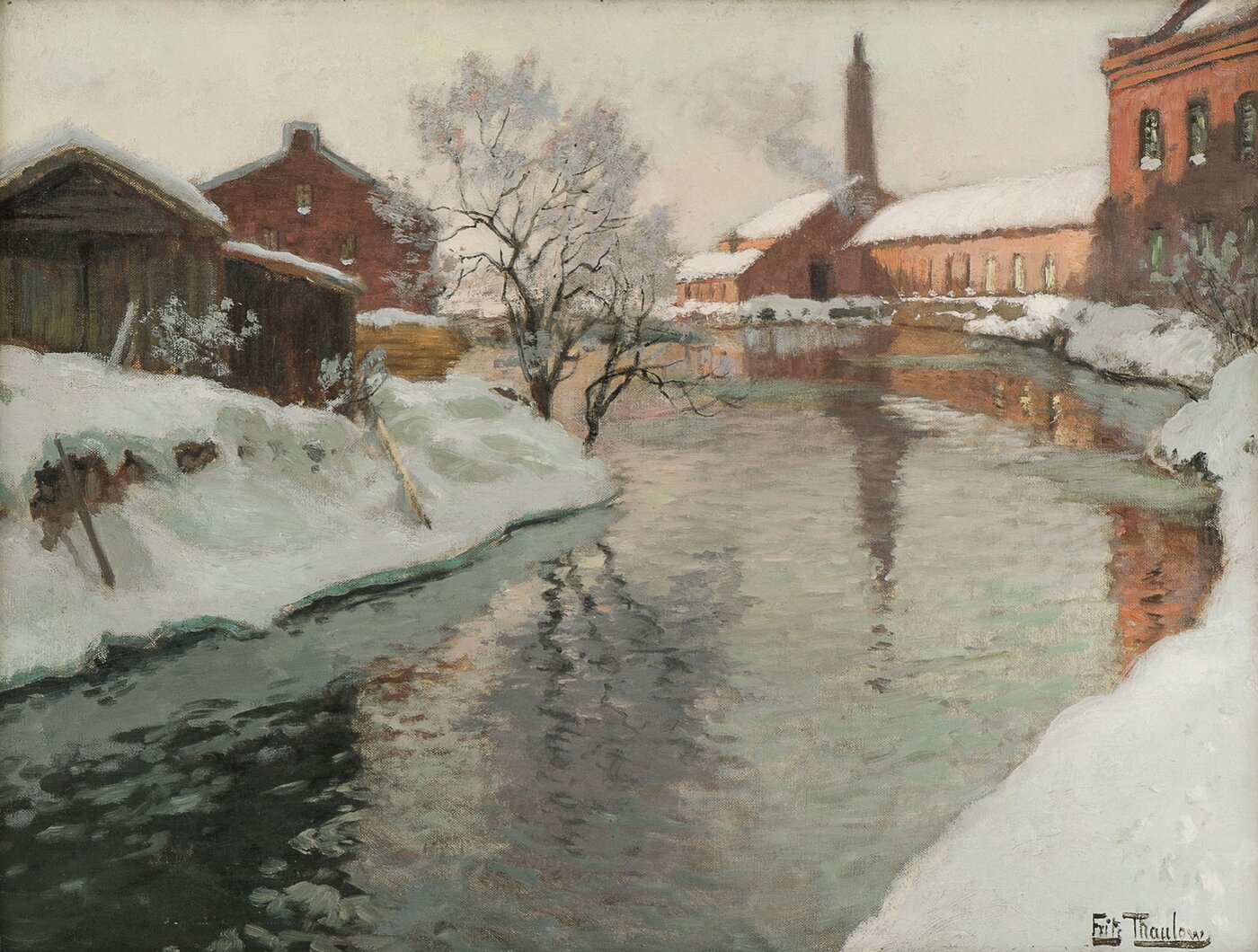Det å fremstille sne ble noe Thaulow igjen og igjen kom til å arbeide med. ”For en maler som var på jakt etter milde, lavmælte valører, som han så dem i sjøens, elvenes og de sølete landeveiers reflekterende flater, måtte snøens flakkende lysvirkninger med dens vàre nyanser i blåfiolette skygger virke uhyre tiltrekkende.” Østvedt, s. 83. Den kjølige atmosfære om vinteren skulle han på en mesterlig måte kombinere med sollysets varmende refleks i vann og bygninger.