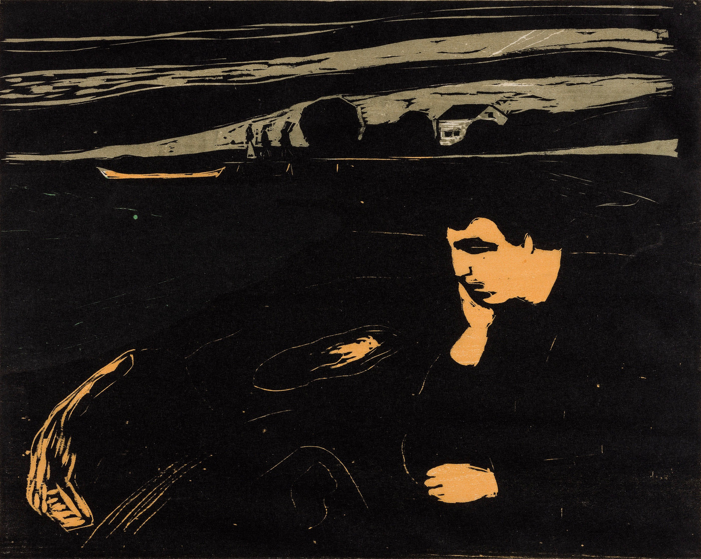 Fargetresnitt trykket i svart, grågrønt og orange på tynt japanpapir