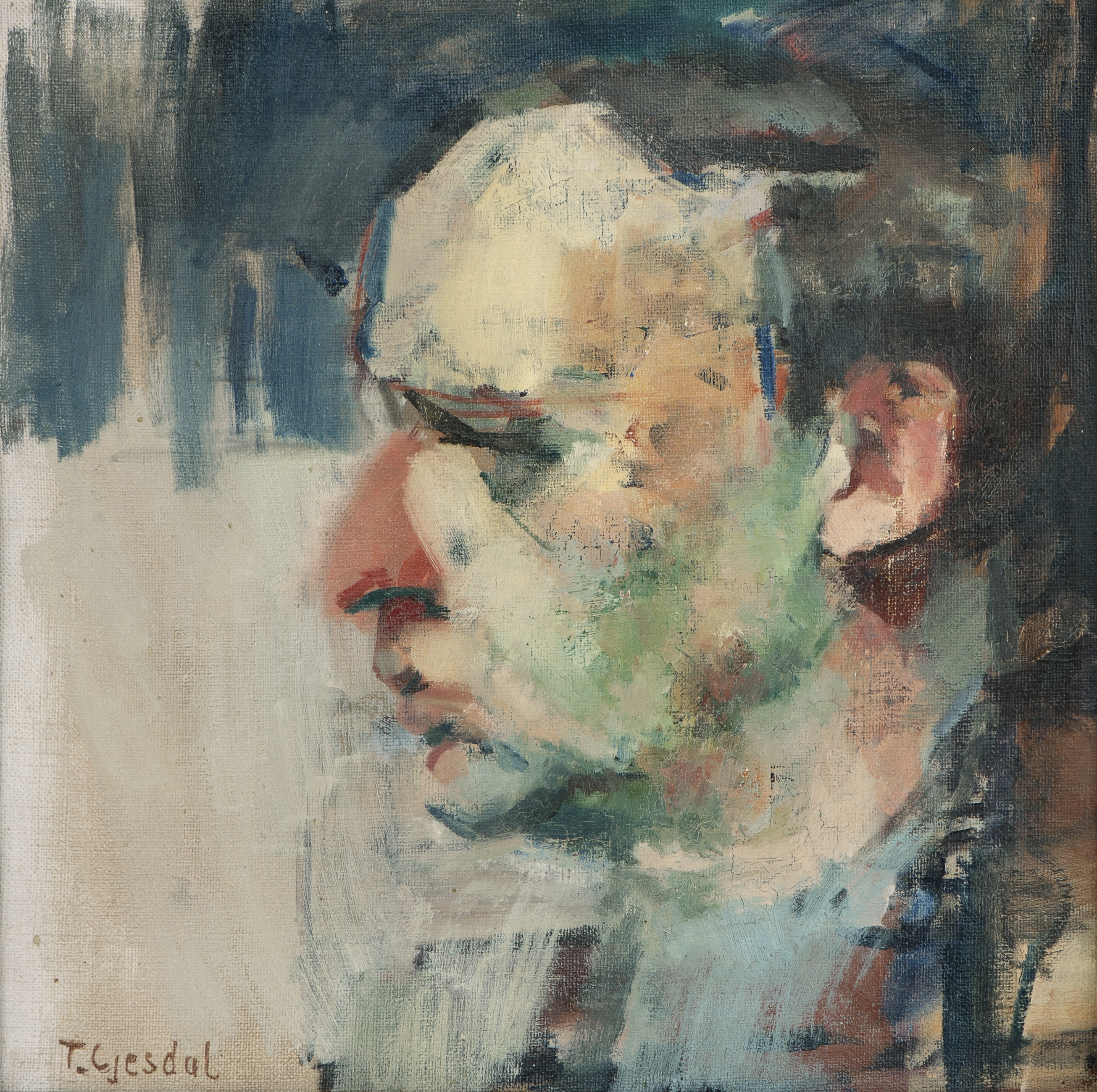 Signert og påtegnet med tittel av kunstneren på baksiden av platen: "Thoralf Gjesdal Stavanger Portrett-skisse". "Portrett-skisse" er overstrøket og istedet står det "Mannshode". Portrettskissen og mannshode er av Stavanger-maleren Georg Backer Berg (1900-1980).