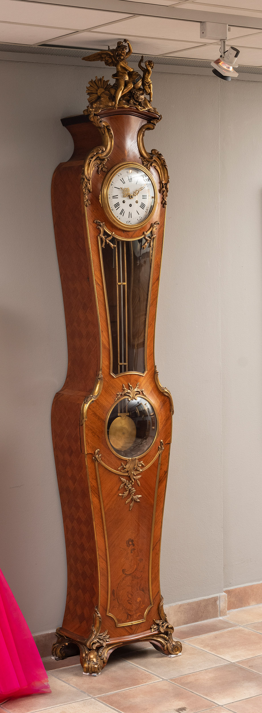 Louis-Philippe-stil, Kontinentet, ca. 1920. Innlegninger i form av romber. Gulvuret montert med bronsearbeider, signert: L Mayer SA (se oppe på kronen av uret). På verket stemplet Gustav Beckers logo med G og B på hver side av et anker med lukket krone på toppen. Gustav Becker (1819-1885) grunnla en klokkefabrikk. Stemplet på verket: "Medaille d'Or", "P95" og serienr. "S 2243714". Også gravert: "Rep. G Næss 1/95" (Januar 1995). Hvit emaljeskive med noen sprekker. Verket følger slagrytmen til Big Ben: "Westminster Gong". 4 toner kvart over, 8 toner halv, 16 toner kvart på og 20 toner hel og med timeslag.