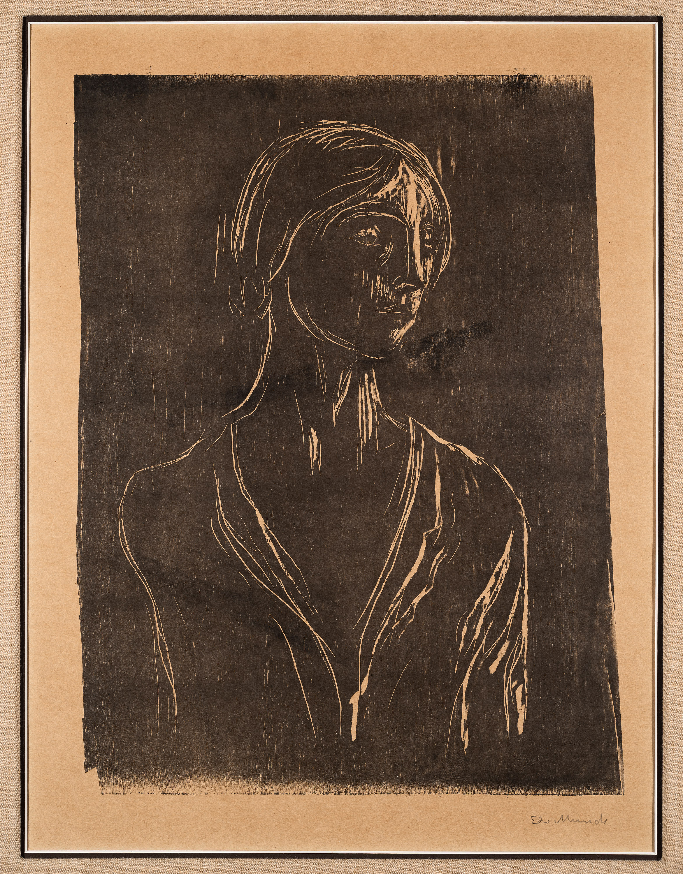 Tresnitt trykket i brunsvart på beige velin