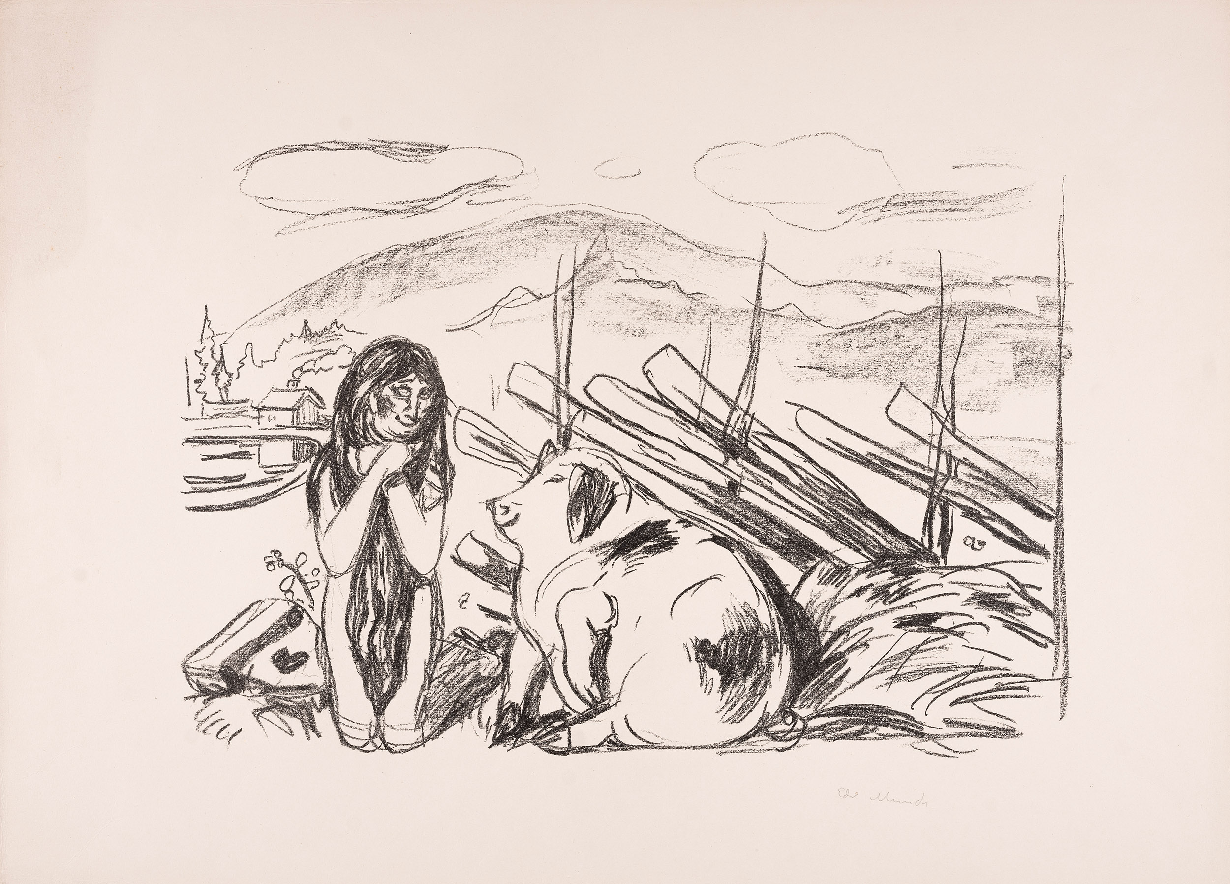 Munchs egne tekst: "Omega følte sig træt og kjed over ikke al kunne eie alle Øens Dyr; hun satte sig ned paa Græsset i voldsom Graad; saa reiste hun sig og løb syg omkring paa Øen og traf Svinet. — Hun knæler ned og skjuler sit Legeme i sit lange sorte Haar, og hun og Svinet saa paa hinanden."