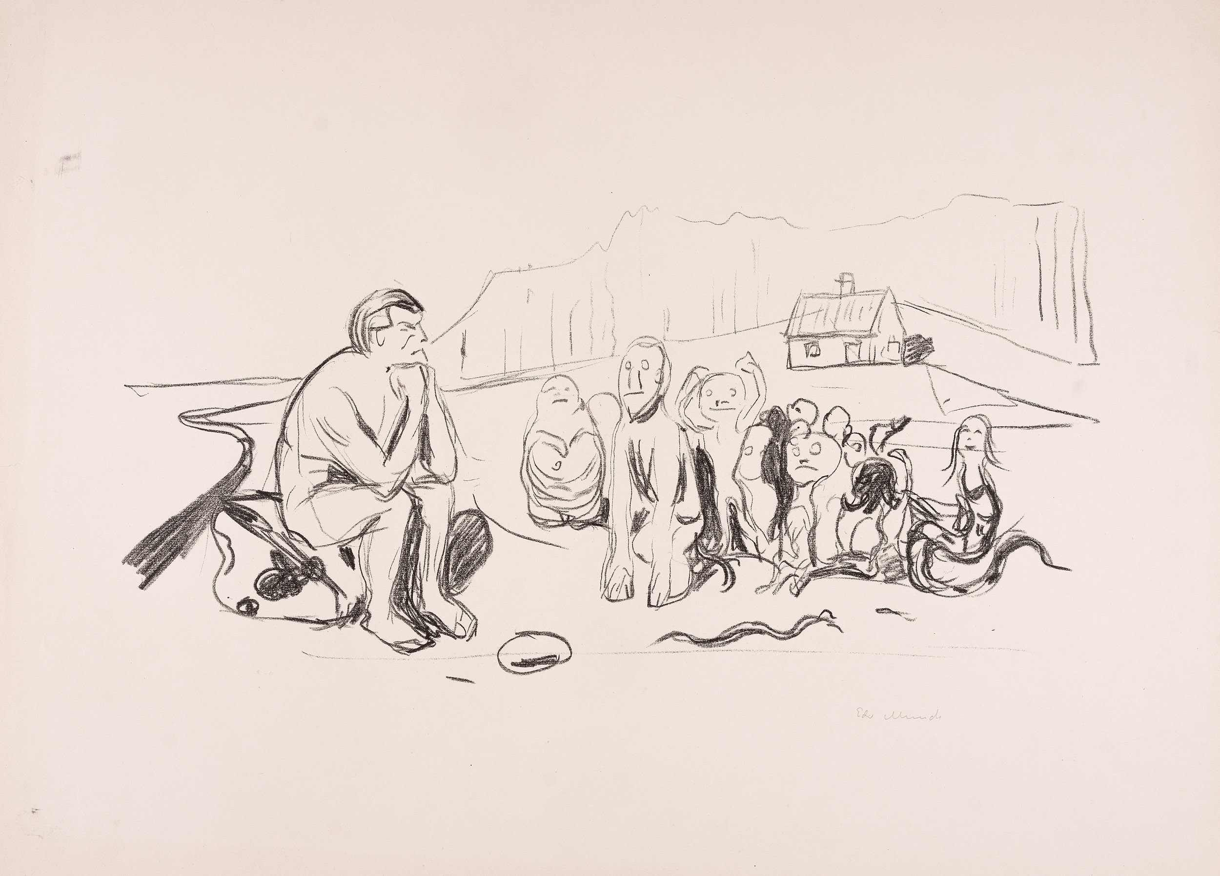 Munchs egne tekst: "Alfa var alene igjen paa Øen. En Dag kom hendes Børn til ham, en ny Slægt var spiret frem paa Øen, de samlede sig om Alfa, som de kaldte sin Fader. Det var smaa Griser, smaa Slanger, smaa Abekatter og smaa Hovdyr og andre Bastarder af Mennesket. Han fortvilede."