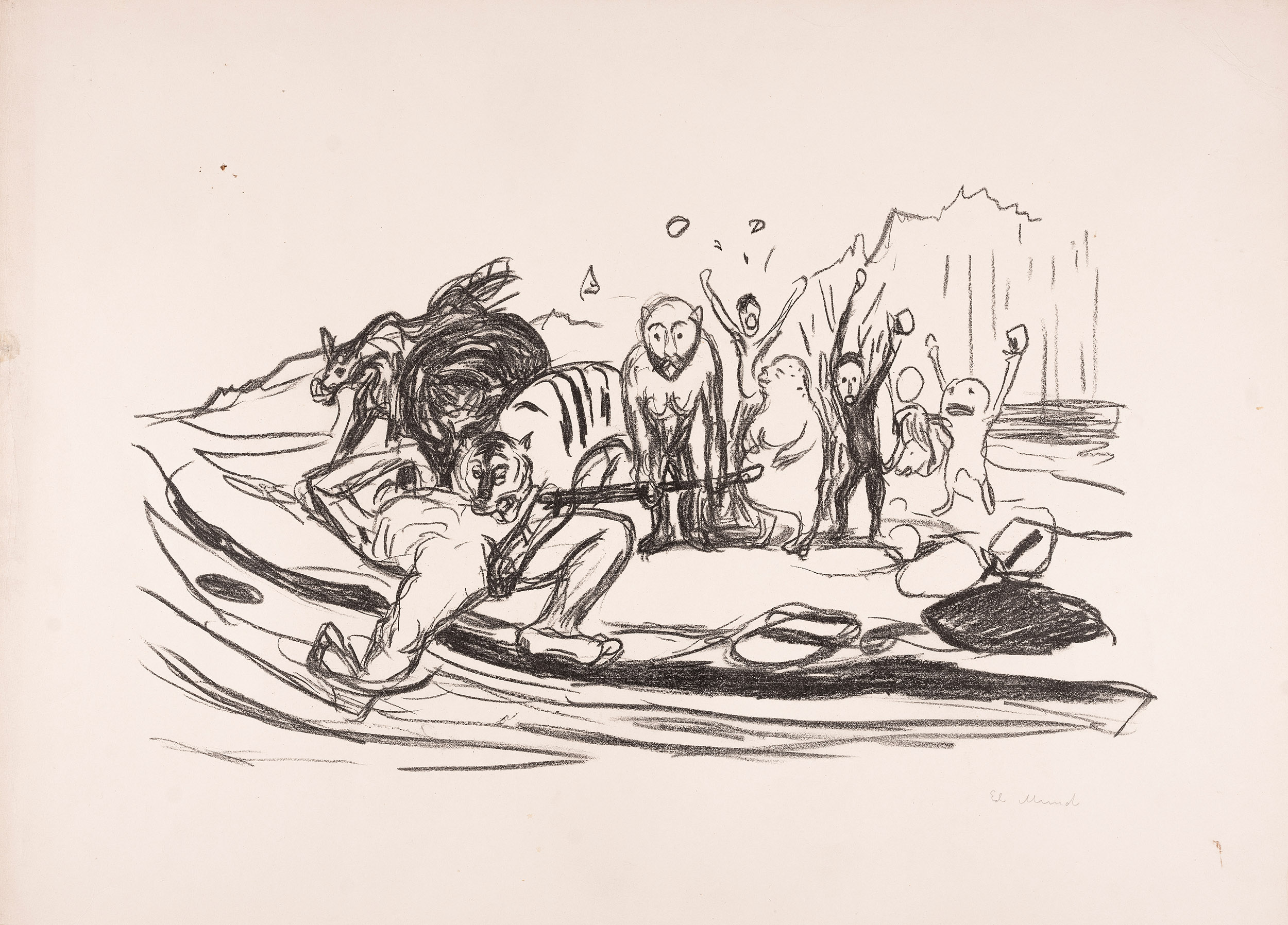 Munchs egne tekst: "Medens han endnu saa paa hende, overfaldtes han bagfra af alle hendes Børn og Øens Dyr, som rev ham istykker.