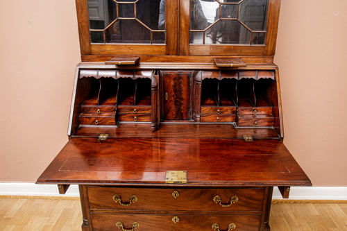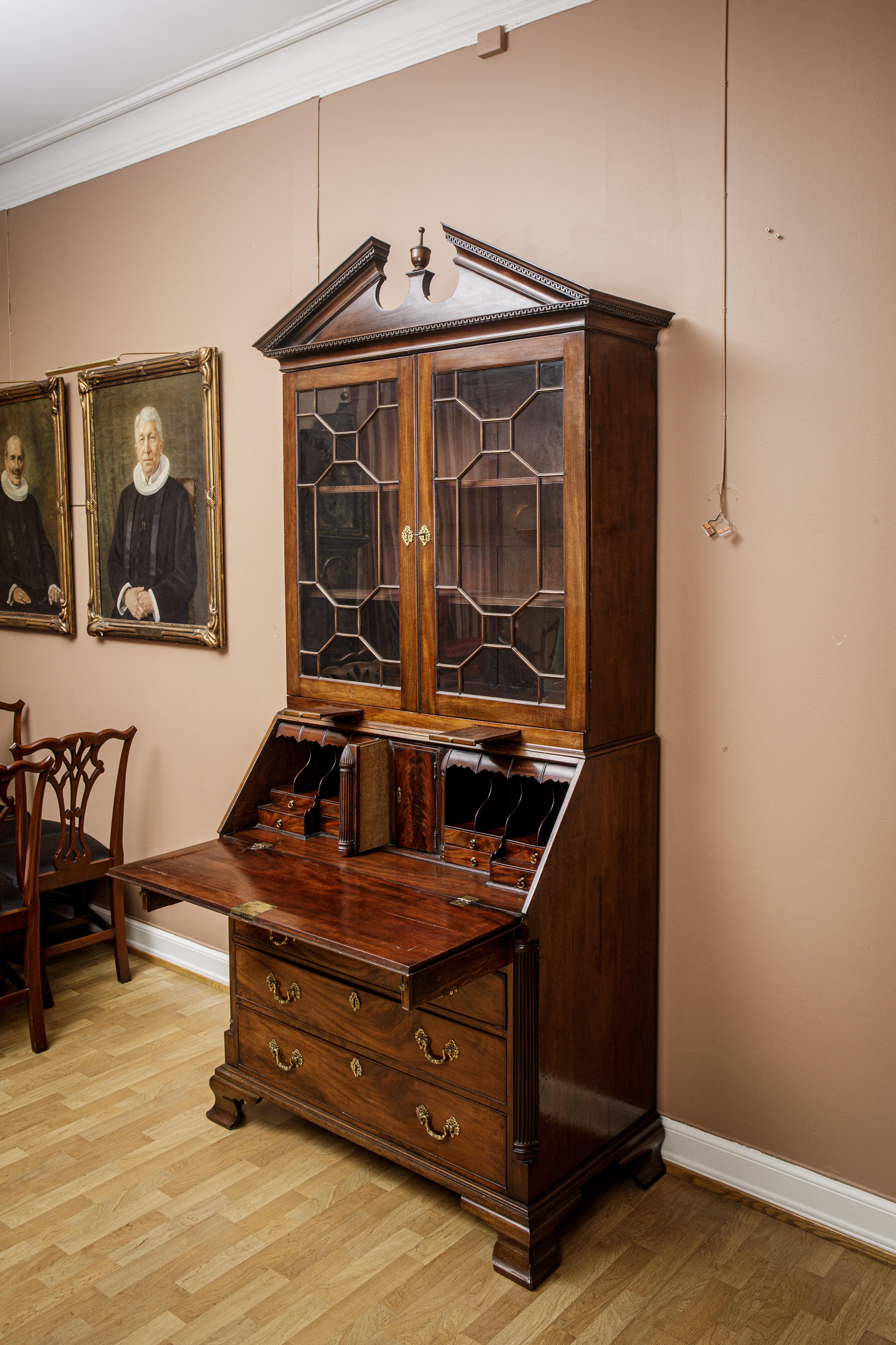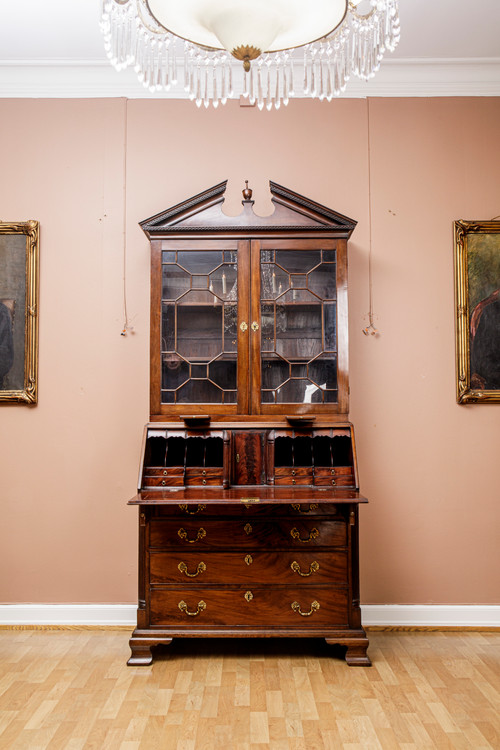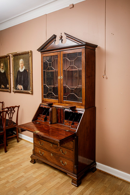 Skriveklaff, bak hvilken 8 små skuffer og rom.