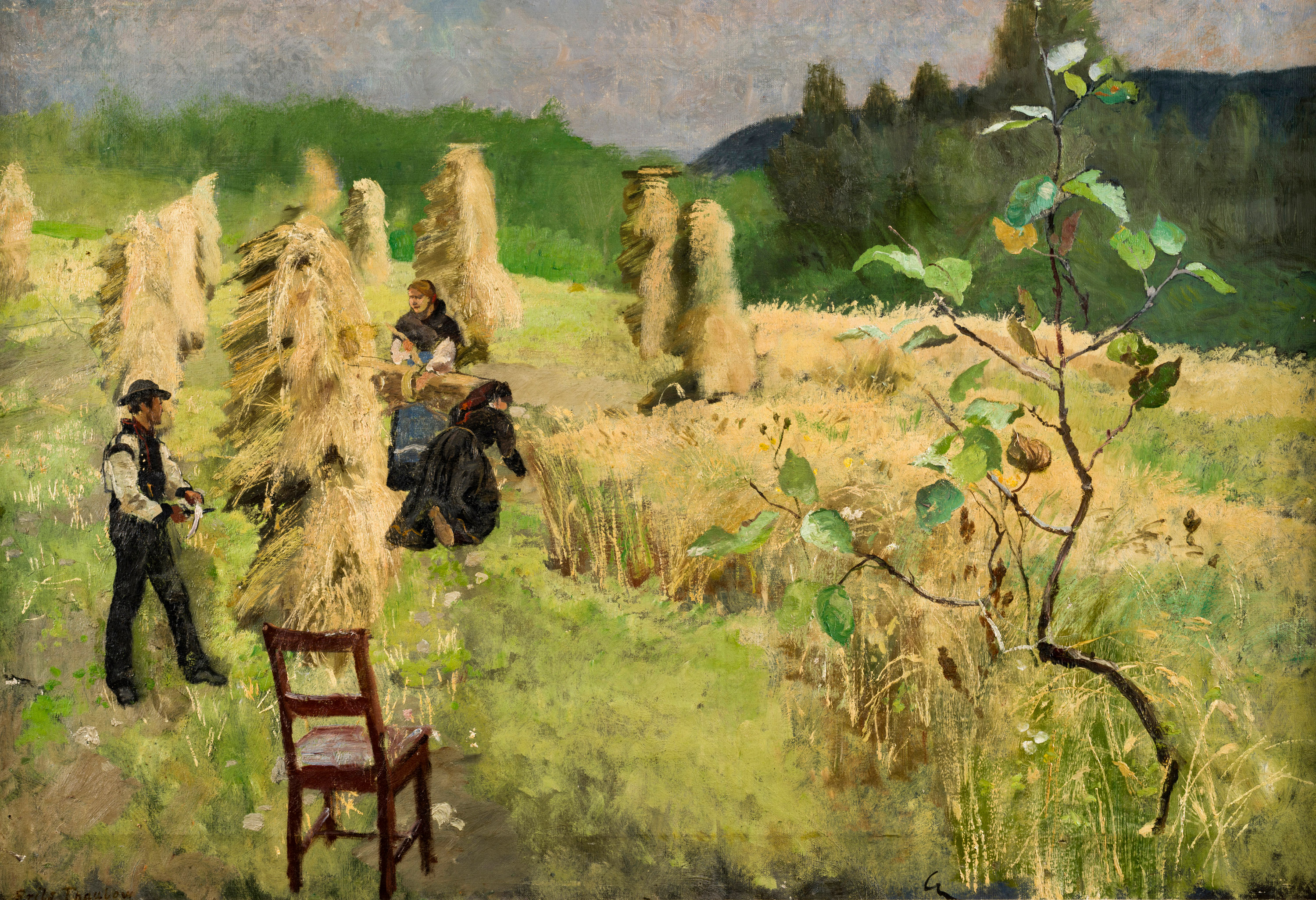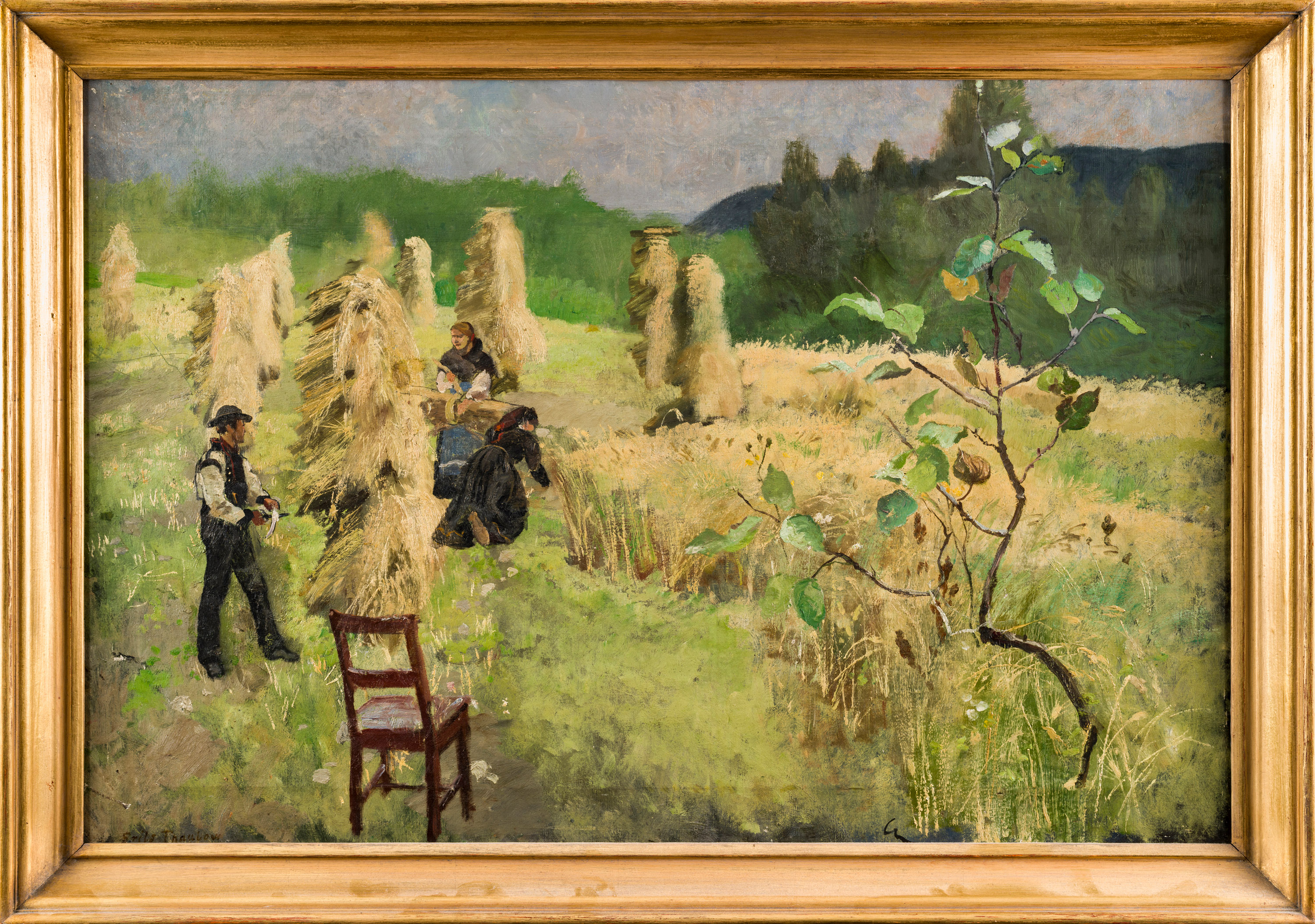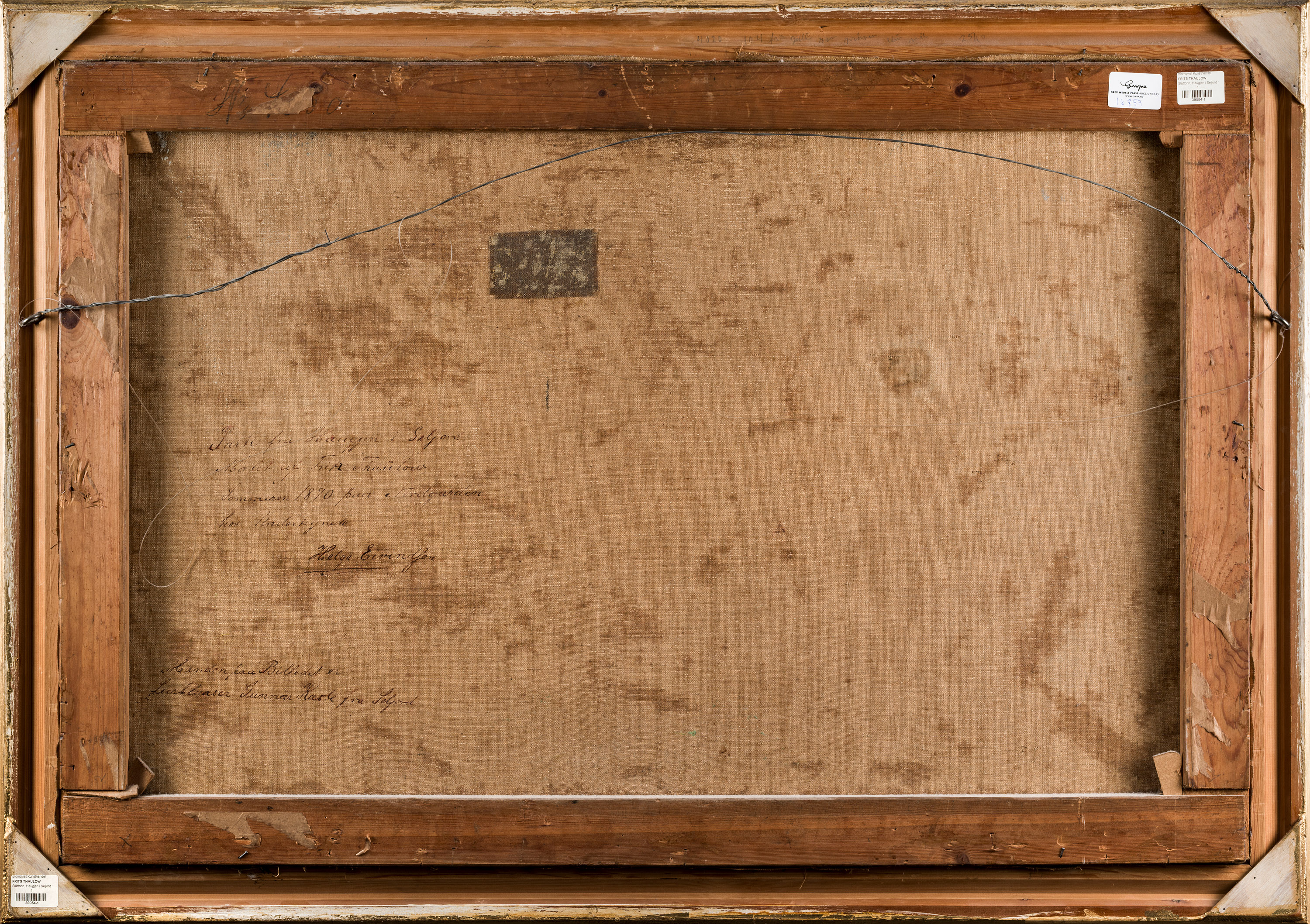 «Parti fra Haugjen i Seljord. Malet af Frits Thaulow Sommeren 1890 fra Nor Garden hos Undertegnede. Helge Eivindsen. Manden paa Billedet er Leirblaaser Gunnar Kaste fra Seljord».