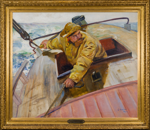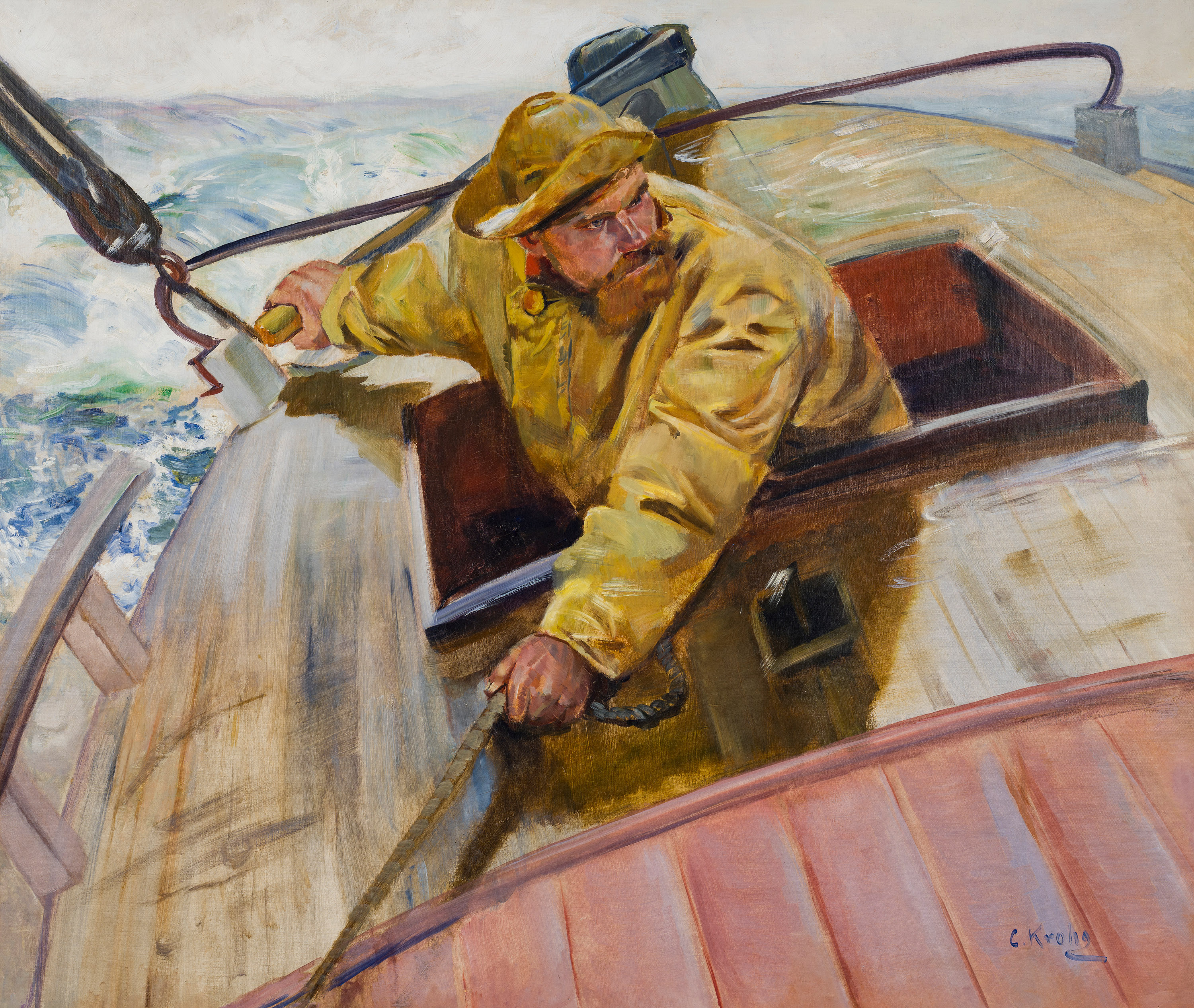 Også her fremstilles den staute, uforferdete sjømann som med sitt mannsmot mestrer havets luner. Men nå er det losen selv som manøvrerer skuten. Krohg har igjen gått tett inn på motivet, der den samme knappe avskjæringen og de skrå vinklene som gir illusjon av sjøgang. Lenet over mot venstre står losen i styreluken og fører roret hårdt over mot styrbord, samtidig som han med venstre hånd strammer skjøtet. En rytmisk bevegelse i skiftende retning kan følges fra skjøtet i forgrunnen over losens utstrakte armer og roret frem til den høye horisontlinjen, der himmel og hav møtes.