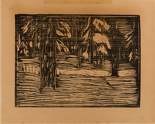 Tresnitt trykket i svart på gulhvitt papir oppklebet på papp