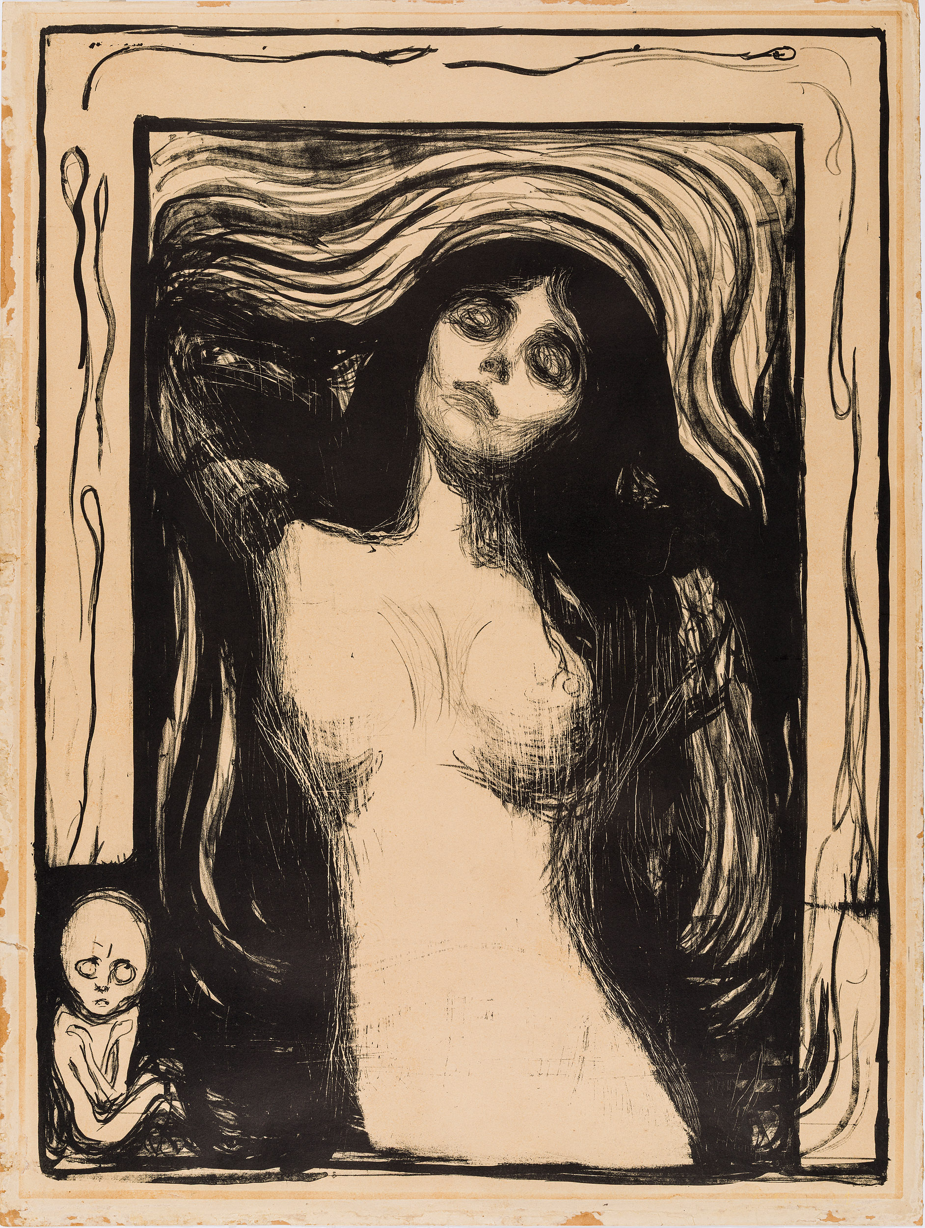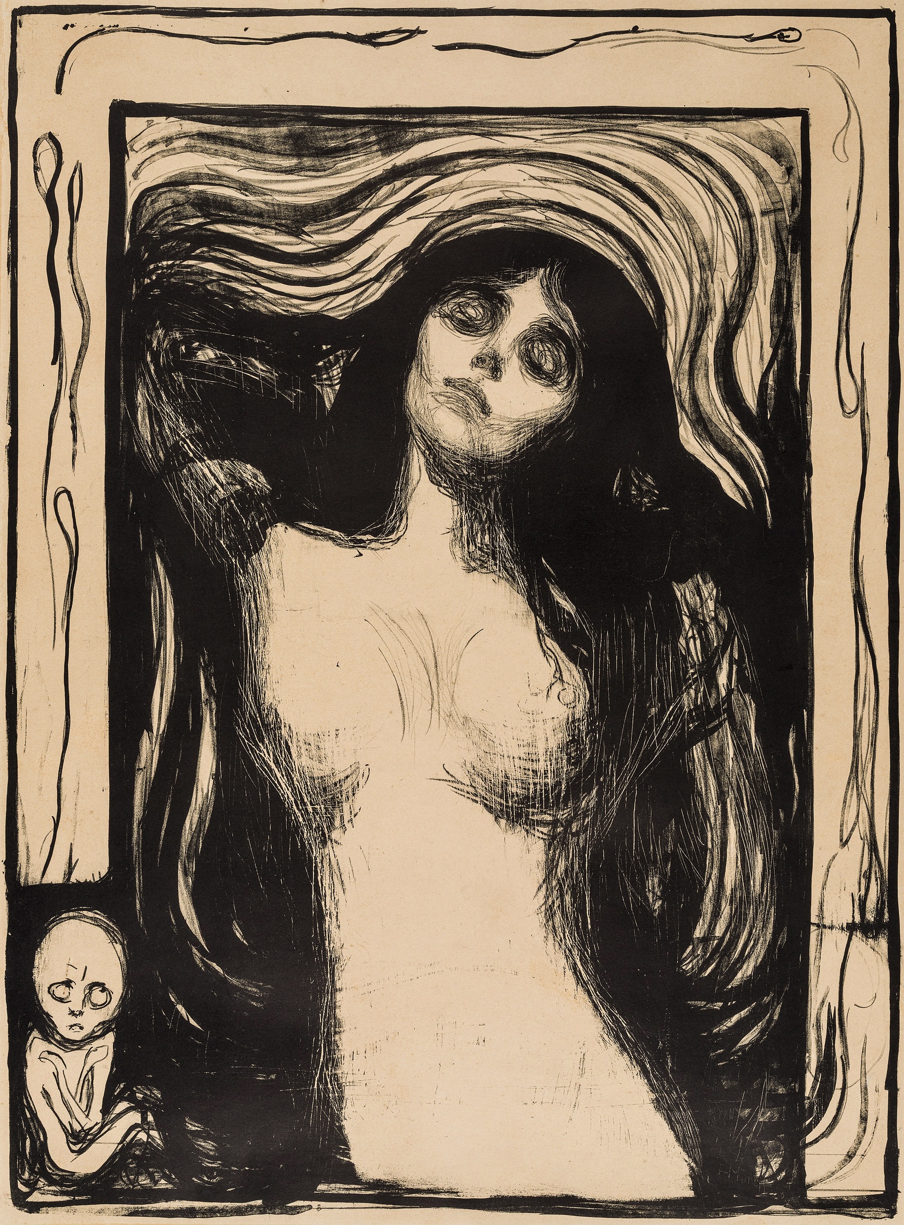 Litografi trykket i svart på gråhvitt kinapapir, oppklebet på kartong