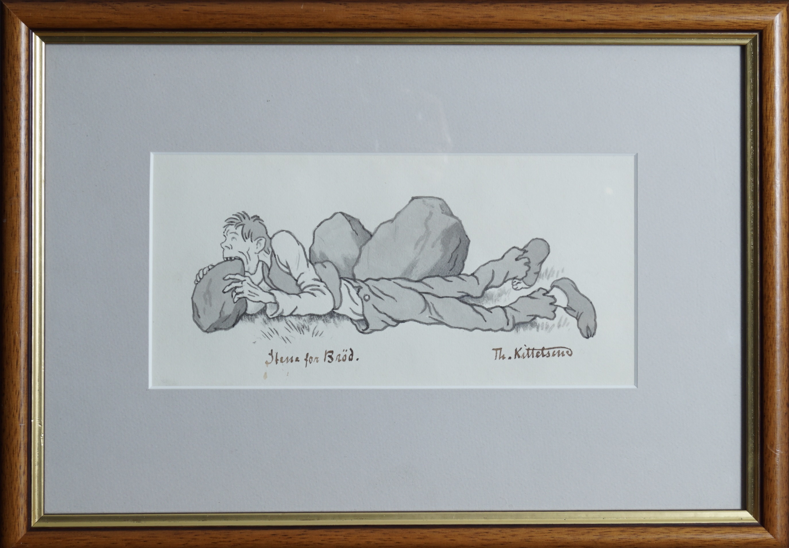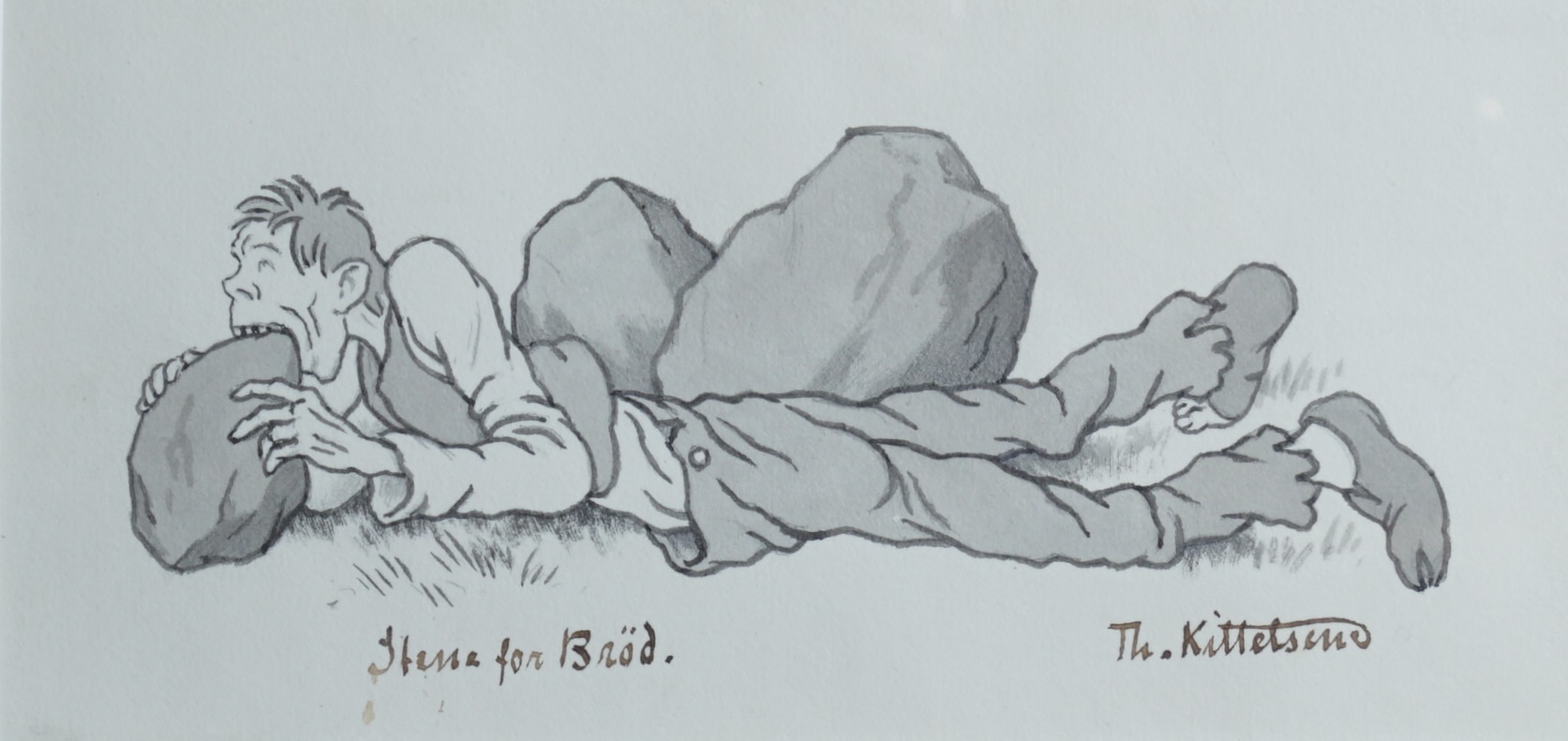 Påtegnet på verso: "Asbjörnsens Eventyr: Askeladden og de gode Hjælperne. - Da han havde seilet et Stykke, kom han til en stor, lang, mager Fant, som laa bortved et Berg og aad Graasten. -- Th. Kittelsen