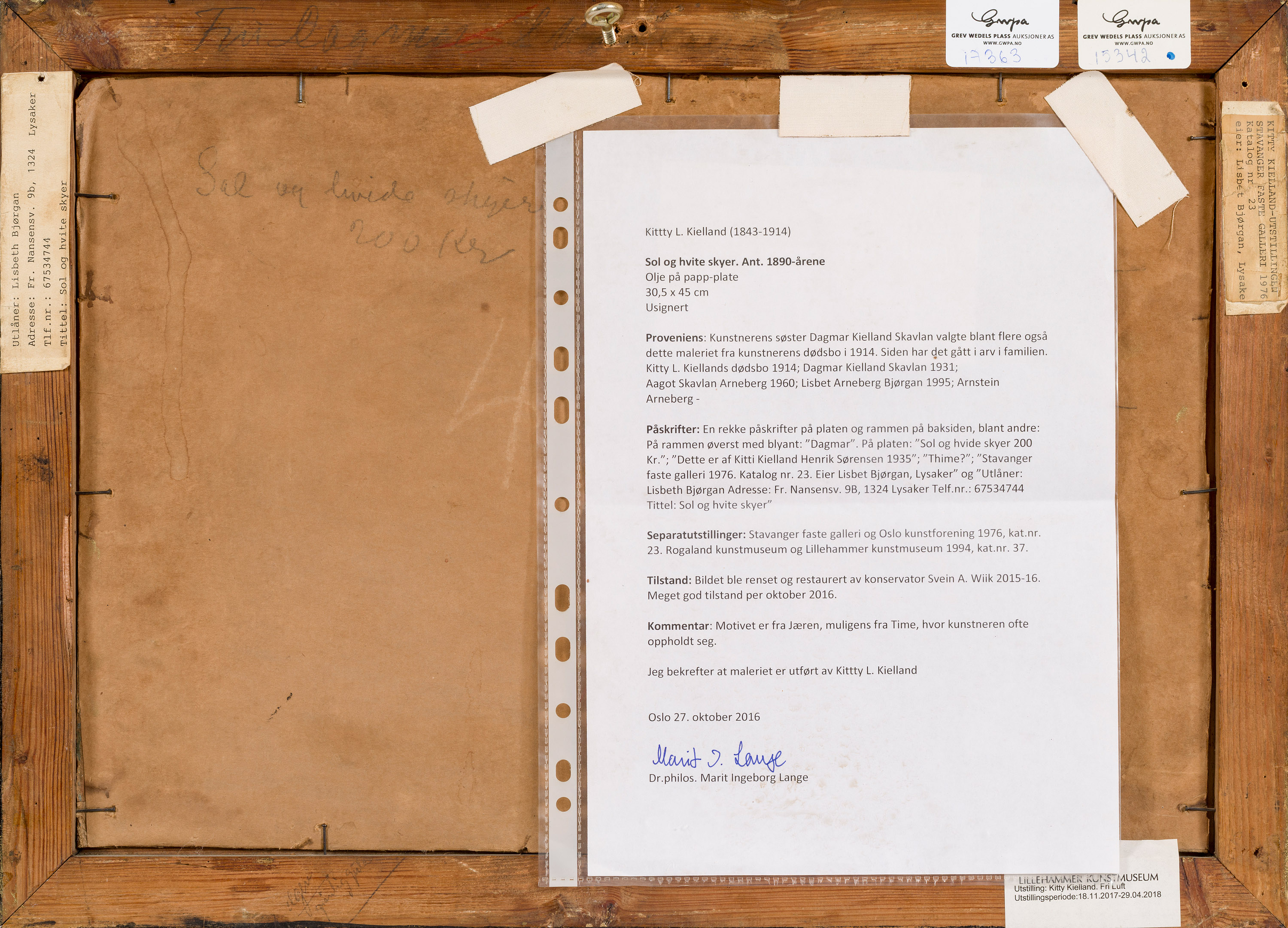 Bekreftet utført av Kitty Kielland av maleren Henrik Sørensen og Dr. Philos. Marit Lange.