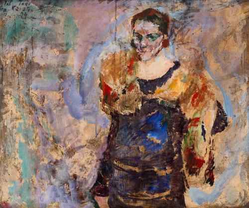 Maleriets påskrift indikerer en personlig tilknytning mellom kunstneren og den portretterte, og taler for at maleriet var ment som en gave. Kompositorisk skiller verket seg fra mer konvensjonelle portretter, ved sitt liggende format og asymmetriske oppbygning. Karsten har portrettert kvinnen fra hoftehøyde, og hun er plassert forskjøvet til høyre side av billedflaten. Formatet, kombinert med en dynamisk og åpen penselføring, kan sees i flere av Karstens verker fra 1920‑årene. Koloritten, som er dominert av blågrønne valører i tett avstemte nyanser, er typisk for kunstnerens arbeider fra samme periode og viser klare paralleller til I tanker (1920) og Dobbeltportrett (1925).